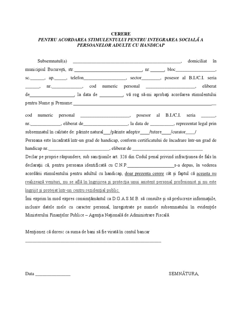 vizitati articolul complet aici : https://www.scribd.com/document/404076243/cerere-adulti-handicap-docx Incepand cu data de 13 noiembrie 2017, la sediile directiei generale de asistenta sociala a municipiului bucuresti se depun cererile privind acordarea stimulentului pentru integrarea sociala a persoanelor adulte cu. Îmi exprim în mod expres consimțământul ca d.g.a.s.m.b. Dreptul la prestatii sociale se acorda incepand cu luna urmatoare celei in care persoana a fost incadrata in grad de handicap.