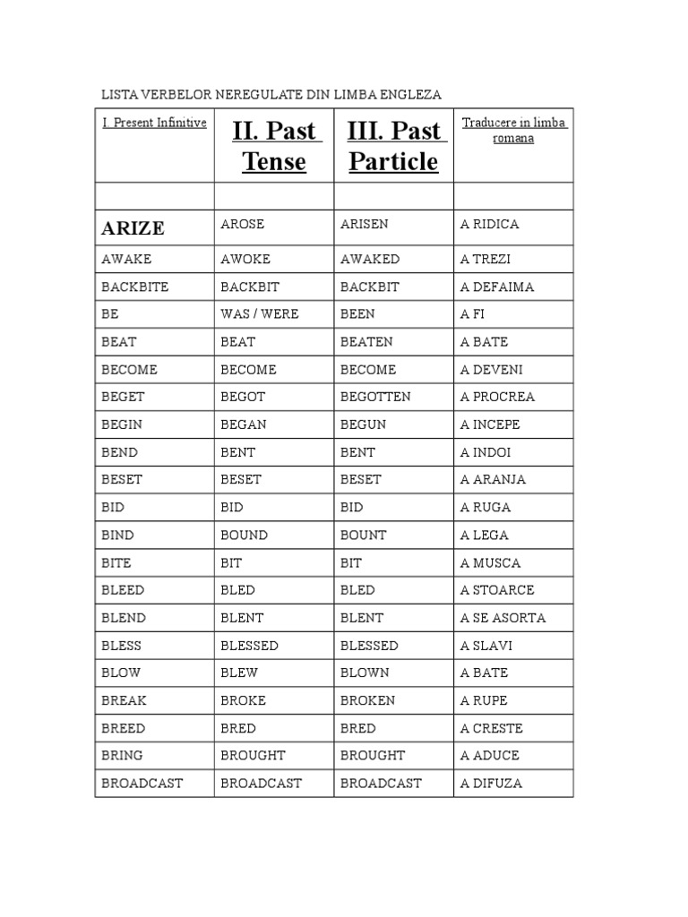 Fară riscuri și fară angajamente. În lista de mai jos sunt enumerate majoritatea verbelor neregulate din limba engleză, împreună cu conjugările lor respectiv traducerea.