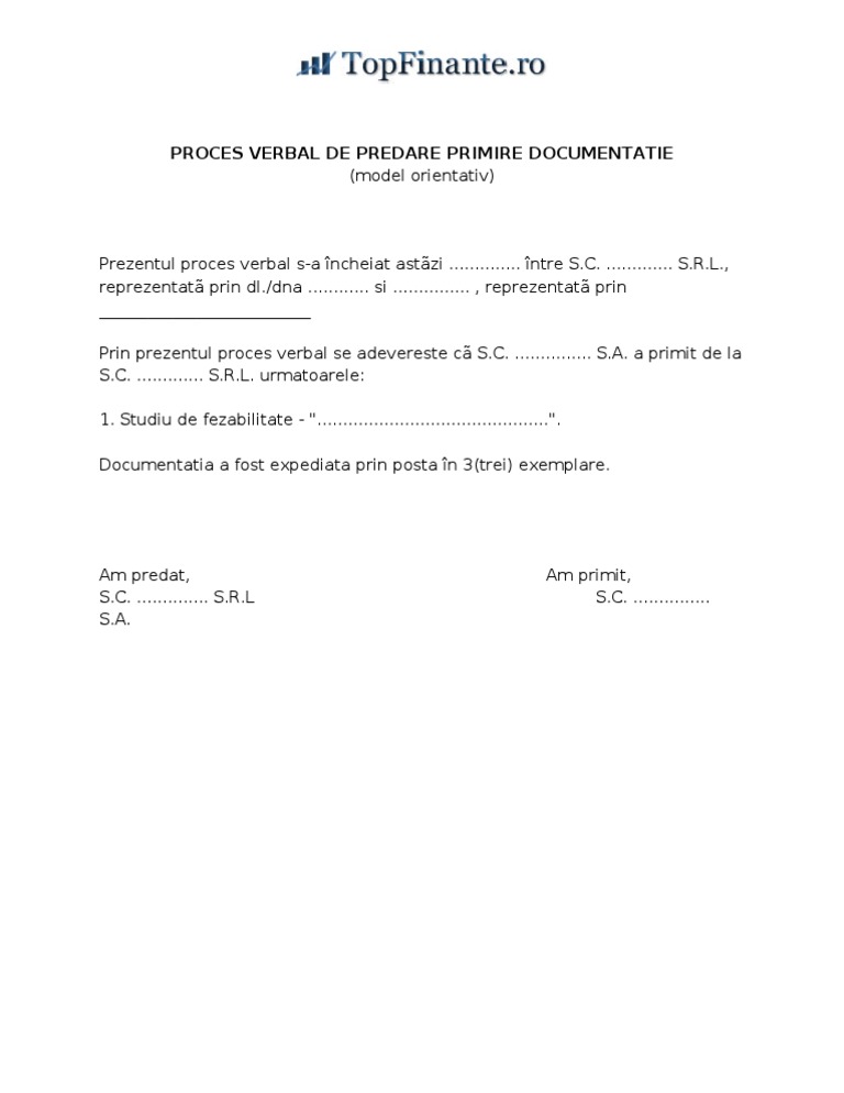 vizitati articolul complet aici : http://www.consultanttehnic.ro/model-proces-verbal-predare-primire-receptie-imobil-nou/ Comisia alcatuita in scopul acestei activitati constata, prin verificare, ca numarul si starea obiectelor de inventar din sala mentionata (conform listei de inventar anexate), corespund cu datele. Modele procese verbale de custodie, predare primire, de casare, de receptie sau proces verbal de inventariere. Download formular model de proces verbal de predare primire in format pdf, word, doc,.