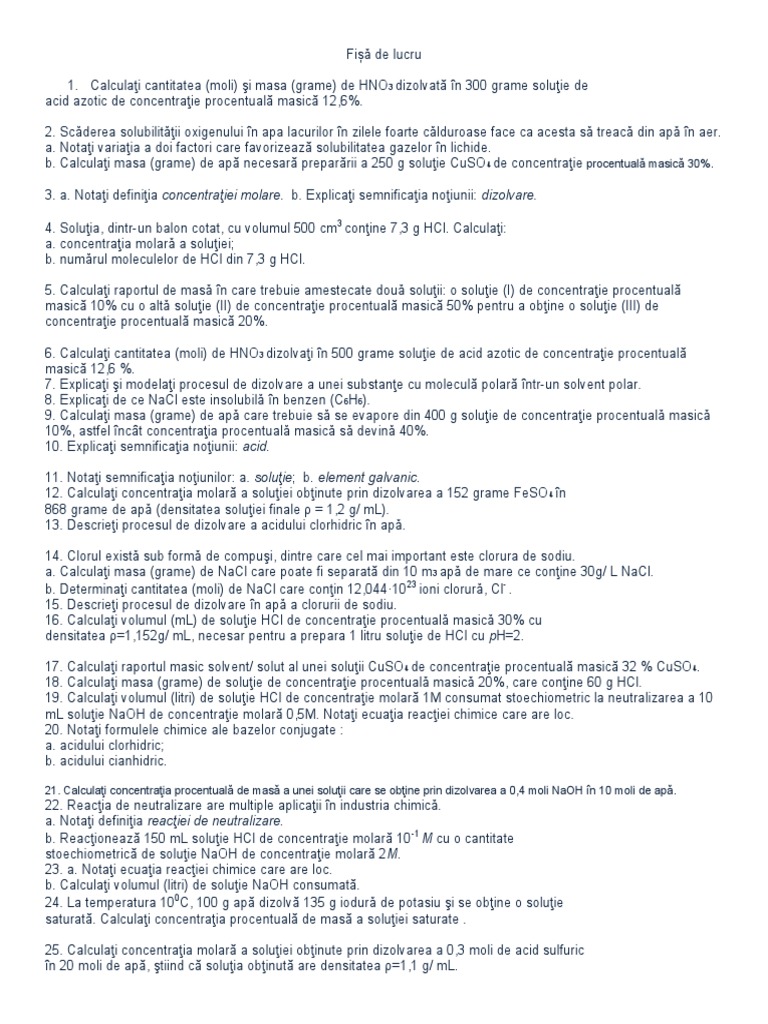 vizitati articolul complet aici : http://grilemedicina.com/solutii-1-110/ Concentratia molara = numar moli substanta dizolvata/volumul solutiei. 1,2 and 3 subscript stands for h₂so₄, hcl and naoh respectively. Ce cantitate de substanta trebuie dizolvata în 400 ml apa pentru a obtine o solutie 30%?