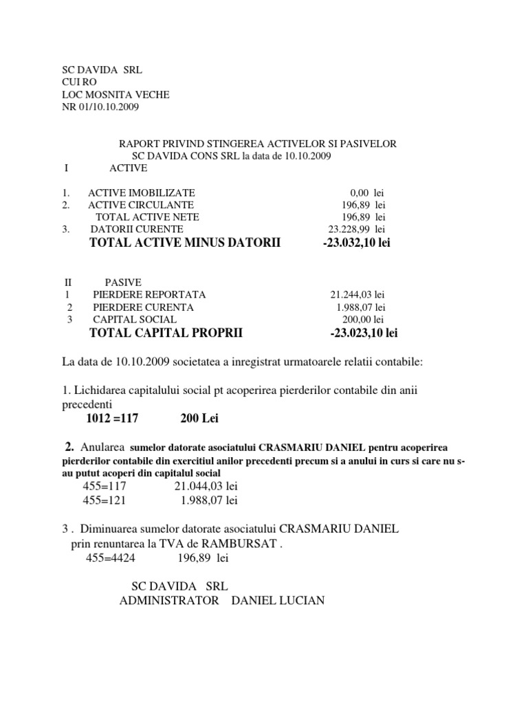 vizitati articolul complet aici : https://idoc.pub/documents/raport-lichidare-d4pqvkz3rvnp Aveti o firma care va da ceva batai de cap? Pentru lichidarea voluntara trebuie sa aveti decizia asociatului unic cu care demarati procedura, urmand sa obtineti un certificat de atestare fiscala prin care sa dovediti ca nu aveti datorii la bugetul de stat, si sa depuneti actele necesare lichidarii la onrc. In situatia urmatoare, asociatul unic al societatii a hotarat lichidarea voluntara a firmei la onrc.