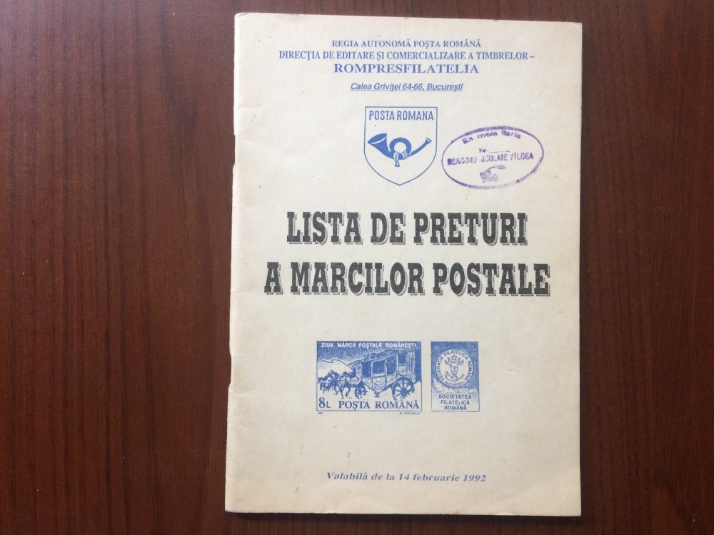 Lista de preturi a marcilor postale timbre filatelie hobby posta romana 1992 alta editura.